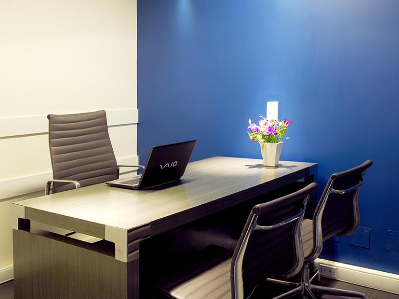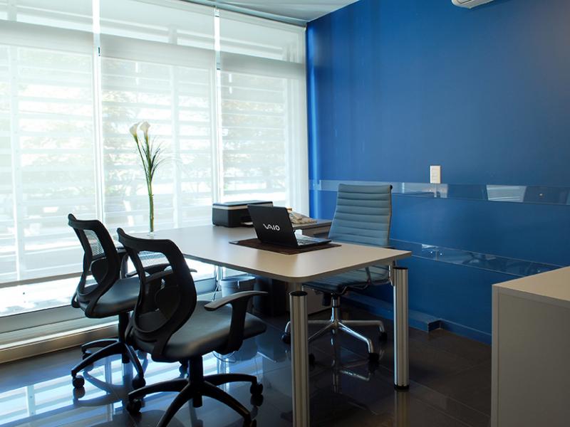 Se eligió el color azul que identifica al logo de la empresa. Se lo usó en paredes de la recepción y sala de reuniones.