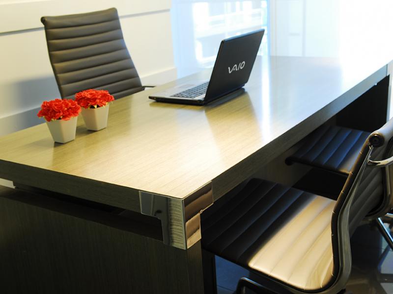 El equipamiento realizado a medida; con materiales nobles como el roble leriex gris y detalles únicos en acero dan una imagen fresca y diferente de oficinas.
